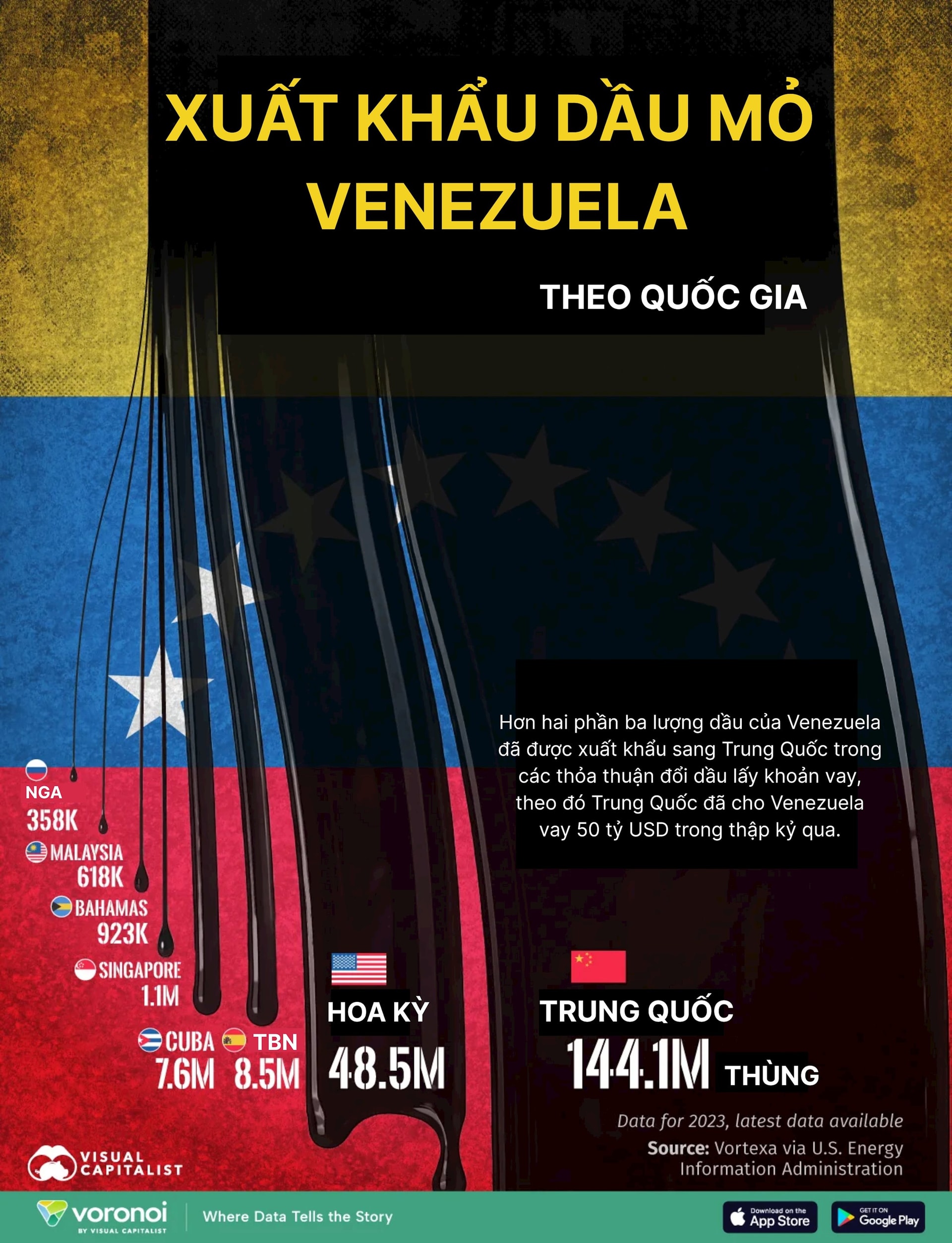 Theo dữ liệu năm 2023 từ Vortexa, được tổng hợp qua Cơ quan Thông tin Năng lượng Hoa Kỳ (EIA), Venezuela đã xuất khẩu tổng cộng 211,6 triệu thùng dầu thô. Đáng chú ý, hơn 90% lượng dầu này được tiêu thụ bởi chỉ hai quốc gia: Trung Quốc và Mỹ.