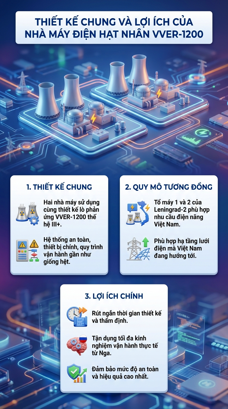 Nhà máy điện hạt nhân Leningrad-2 gồm tổng 4 tổ máy: Tổ máy số 1 hòa lưới từ năm 2018, Tổ máy số 2 theo sau năm 2020 (Nhà máy điện hạt nhân Ninh Thuận 1 sẽ có 2 tổ máy tương tự tổ máy 1 và 2 của Leningrad-2). Công việc đang được đẩy mạnh cho Tổ máy số 3 (và sắp tới là Tổ máy số 4).